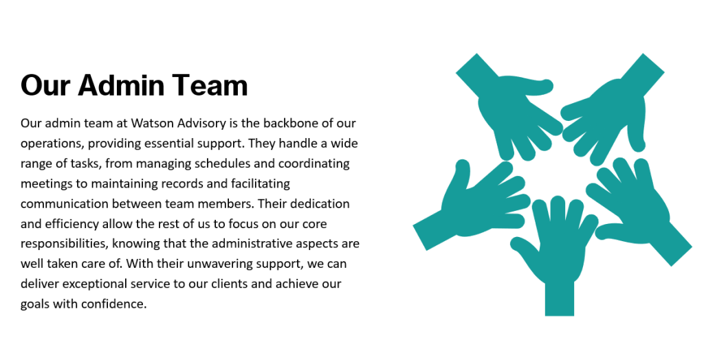 Our admin team at Watson Advisory is the backbone of our operations, providing essential support. They handle a wide range of tasks, from managing schedules and coordinating meetings to maintaining records and facilitating communication between team members. Their dedication and efficiency allow the rest of us to focus on our core responsibilities, knowing that the administrative aspects are well taken care of. With their unwavering support, we can deliver exceptional service to our clients and achieve our goals with confidence.