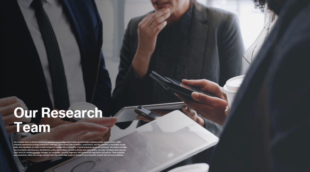 Our research team at Watson Advisory is dedicated to providing expert advice and innovative solutions across various sectors. With extensive experience in energy investment challenges, government policy interface, social licence, and the evolution of Australian energy policy and regulation, our team is well-equipped to navigate the complexities of government processes and pathways. We excel in strategic communications and advocacy, electrification policy and solutions, as well as climate and nature policy. Our team members have a proven track record in creating bespoke strategies for companies, ensuring alignment with government regulations and policies. Their expertise and connections within the energy industry make them invaluable assets in driving forward impactful research and advocacy initiatives.